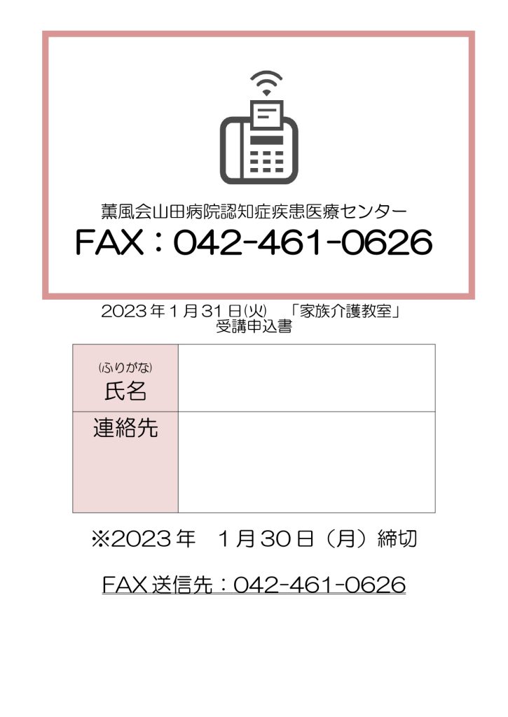 令和5年1月31日に第3回家族介護教室を開催いたします。詳細はチラシをご確認ください。事前申し込み制となりますので、チラシをご覧の上、1月30日(月)までにFAXまたは電話にてお申込みください。